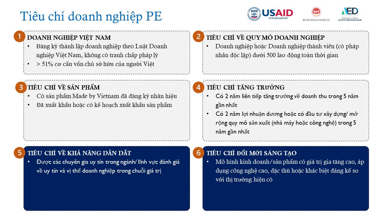 With the goal of creating "Made by Vietnam" branded products and successfully exporting them to regional and international markets, the PE program has attracted considerable attention from pioneering domestic businesses. These are businesses that meet strict criteria such as registration under the Vietnamese Enterprise Law, no legal disputes, and ownership structure with over 51% held by Vietnamese individuals.