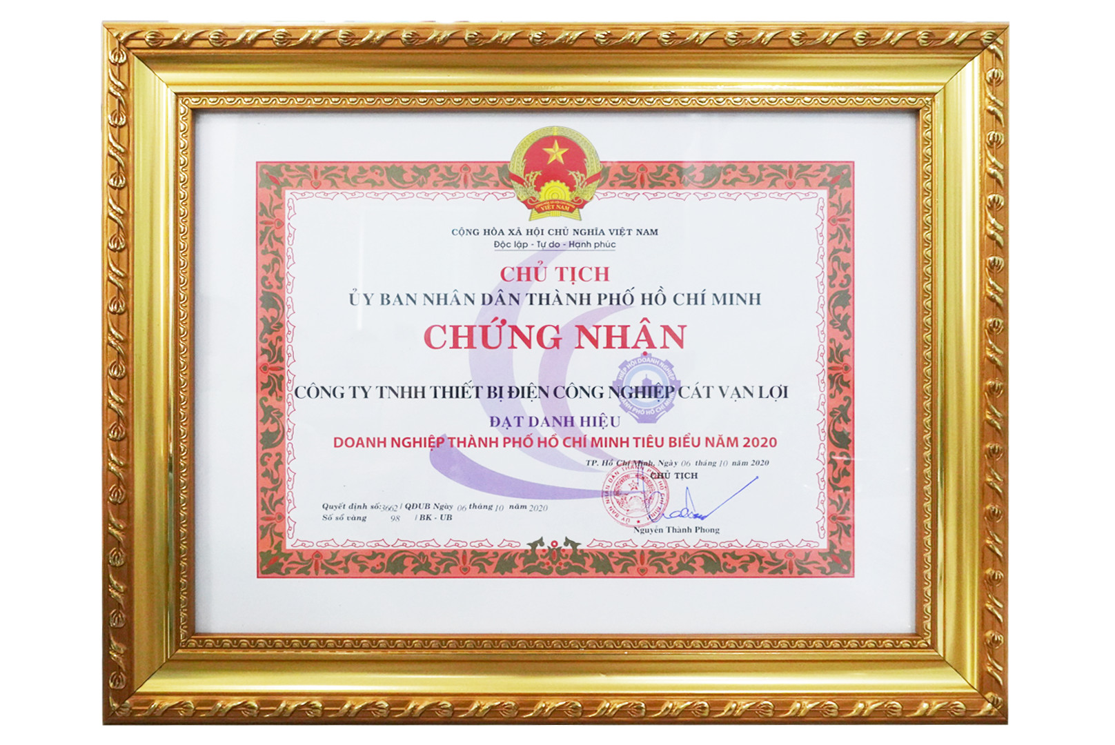 Công ty CÁT VẠN LỢI được Ủy Ban Nhân Dân TPHCM trao giải thưởng Doanh nghiệp tiêu biểu TP.HCM năm 2020