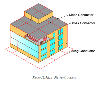 If the structure to be protected has different roof levels, we have to install mesh of suitable size on all the roof levels and the mesh of different roofs should be interconnected. An Example of mesh protection system for flat roof structure is as follows.