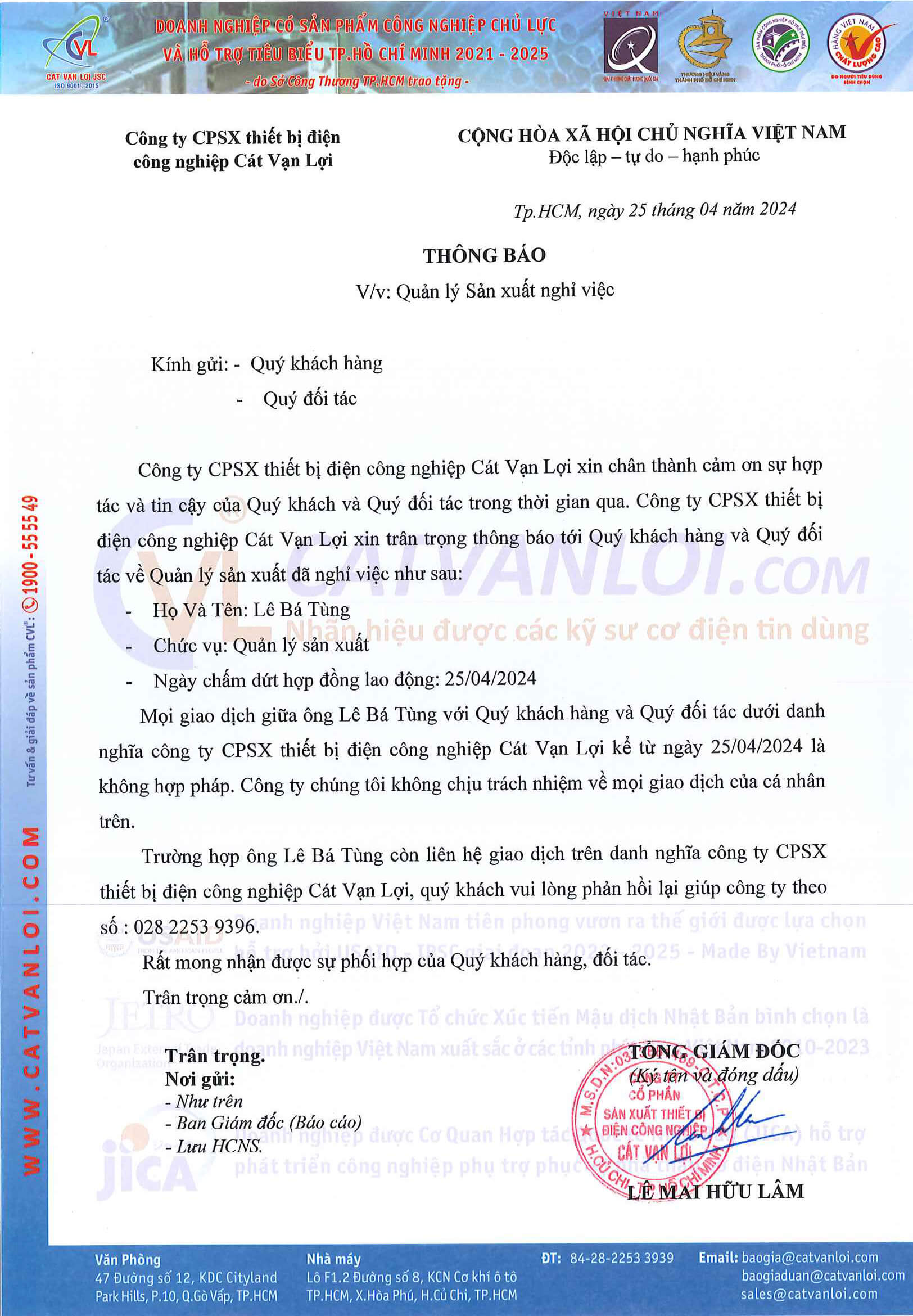 Trường hợp ông Lê Bá Tùng còn liên hệ giao dịch trên danh nghĩa công ty CPSX thiết bị điện công nghiệp Cát Vạn Lợi, quý khách vui lòng phản hồi lại giúp công ty theo số : 028 2253 9396.